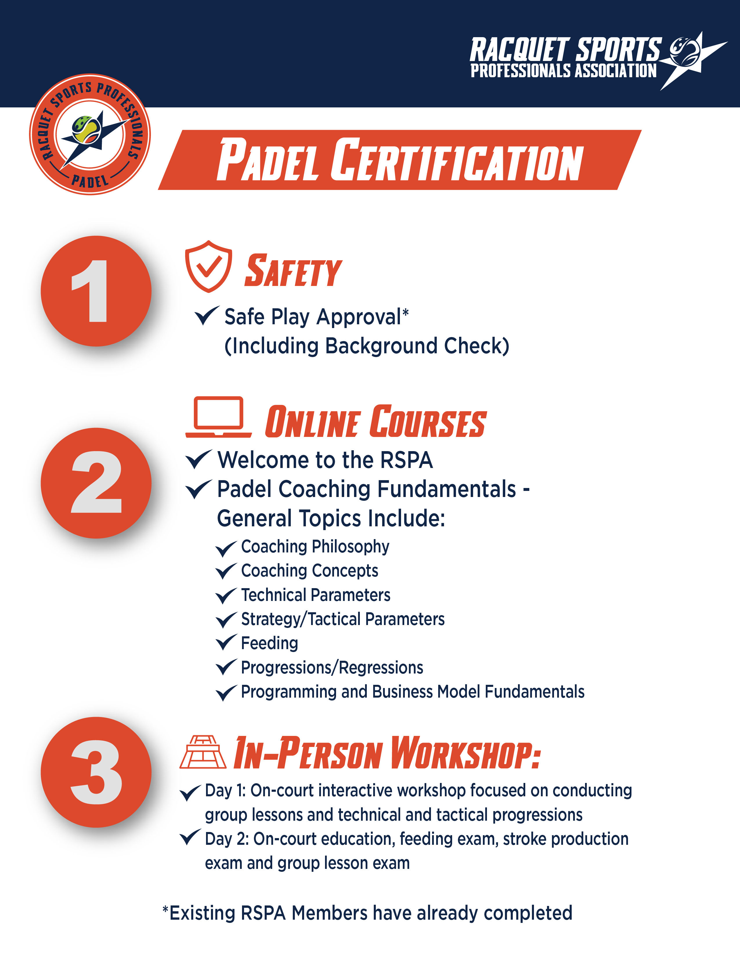 The Racquet Sports Professionals Association (RSPA) is excited to introduce its new Padel Certification, now available to both new and current members. This certification provides an opportunity for players and coaches to advance their careers and deepen their passion for racquet sports. Developed with the expertise of RSPA Master Professional and padel expert Marcos del Pilar, this certification delivers thorough online and in-person training in padel coaching fundamentals, including technical and tactical skills and program development.