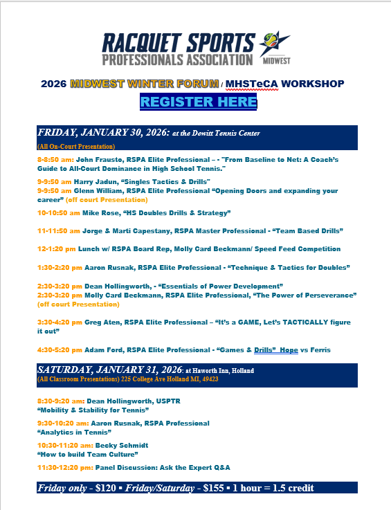 Join the RSPA Midwest Division in partnership with the Michigan High School Tennis Coaches Association for an unforgettable two-day experience on January 30–31, 2026!